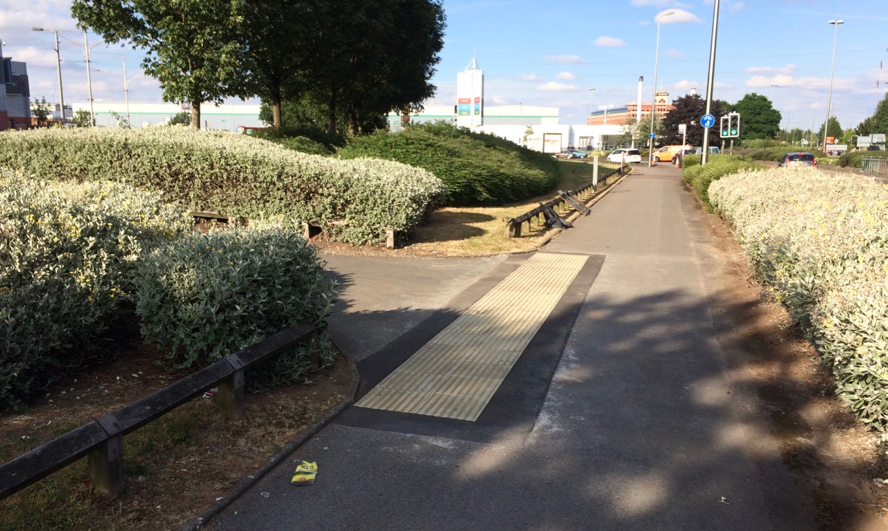 This stretch of tram-line tiles is notable for being the only mis-use of textured tiles along the whole 5 miles of the route. This is to be lauded. These tiles, however, need to be removed as they are creating a hazard for cycle users along this section. They should be located inside the side path rather than on the main footpath, if they are to be used at all. The only reason for them to be in this location is that there might be a boundary between the Fort Shopping Centre land and the BCC Highways land preventing BCC installing them in the correct fashion.