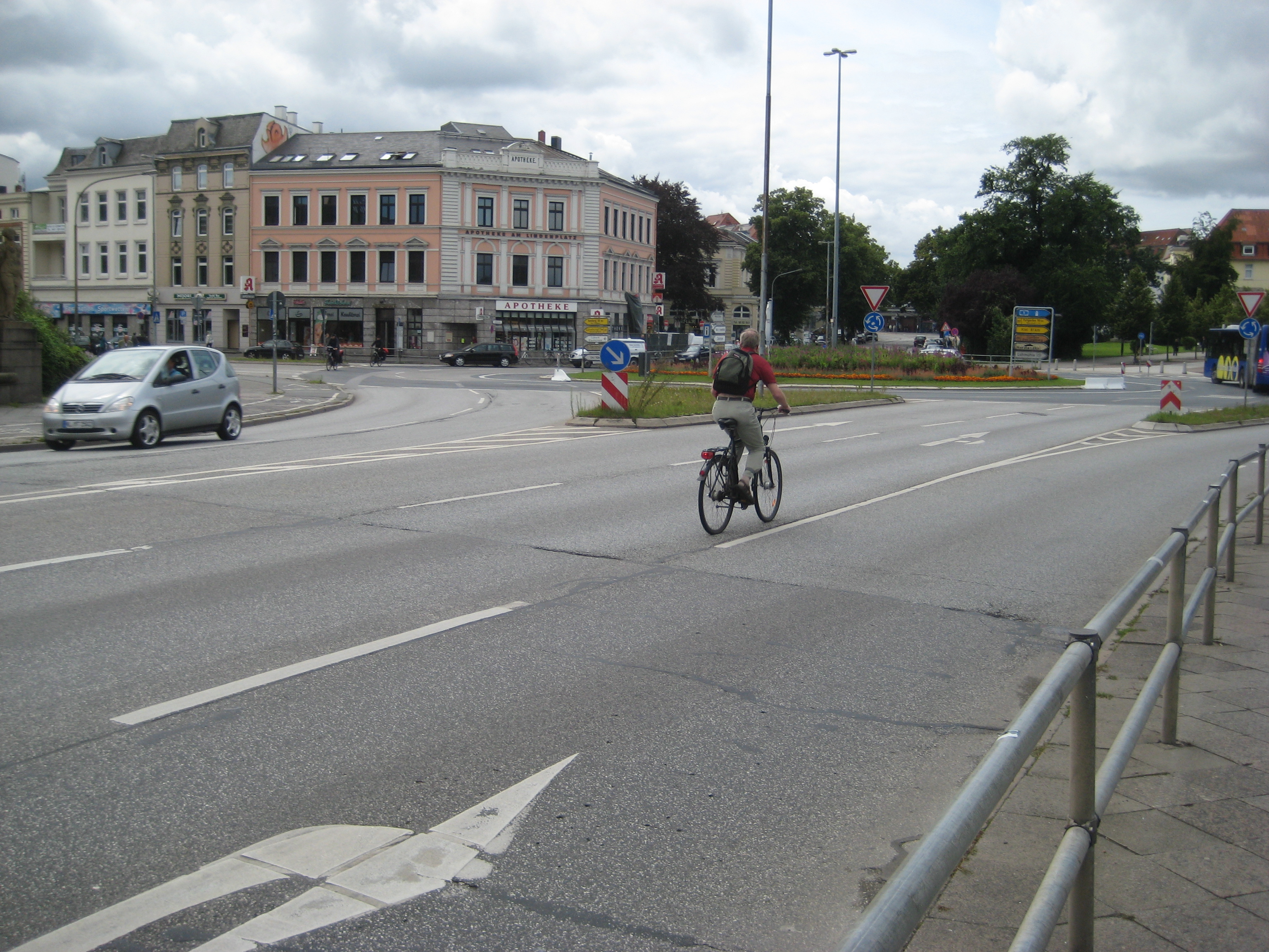 This roundabout in Lübeck is an example of how not to do things. There is no cycling infrastructure, and unusually in my experience it has more than one lane. It's usually rammed with motor traffic, and it represents a really unpleasant barrier between the historic city centre and the station, which is a route that many, many tourists will want to take. Despite the very high levels of motor traffic, the asphalt is in generally good condition, though I can see a couple of pothole candidates behind the person on a bike that probably would not be problematic for cyclists (they appear to be due to a bad carriageway section join). The dark grey patches you can see on the roundabout itself are the result of yet another attempt by the city authority to make this junction work.