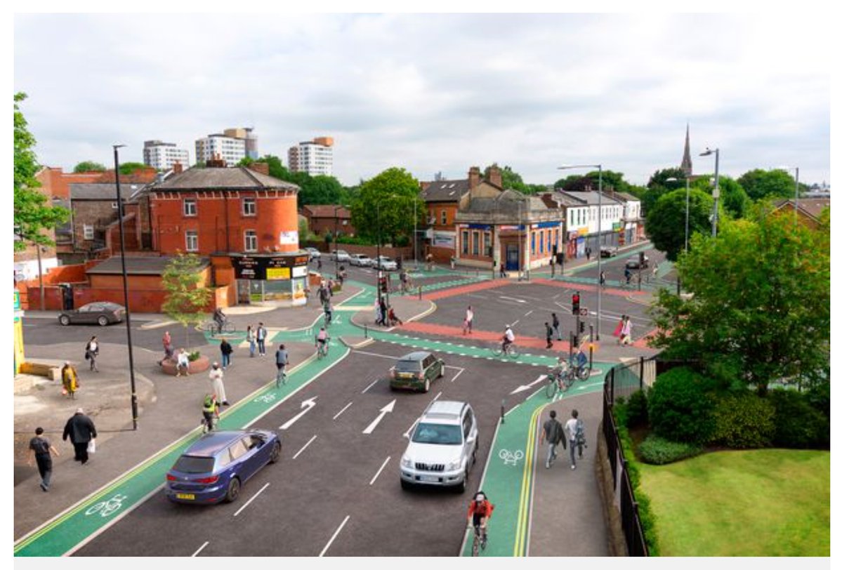 An artist's impression of Chorlton's segregated cycle tracks and protected junction, which will funded through TfGM's Beelines project.