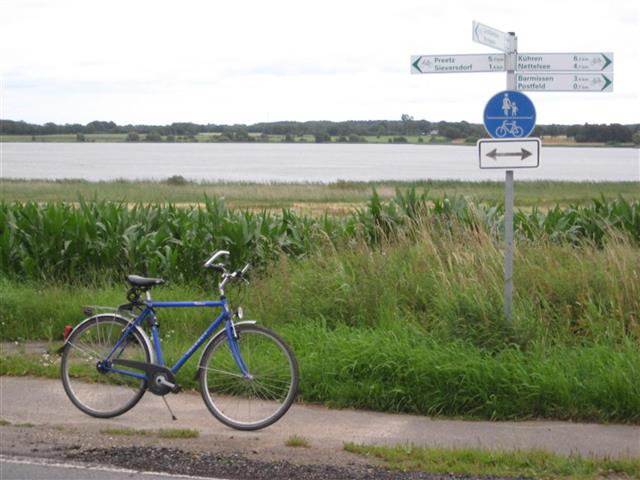 This is a typical, detailed German signpost for cyclists. It is so detailed Google Maps can be used to triangulate its position very accurately. The shared-use footpath is not so good, though it sees so little traffic (this is a somewhat remote location) it is in practice very usable.