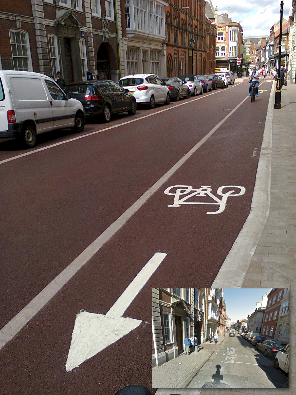 This contraflow lane is rather narrow and a slight upstand on the kerb makes it awkward to use the carriageway for overtaking and social riding if the carriageway is clear. The smooth hump separating it from the footway does allow cyclists to cross over on to the footway safely, but that is not something that pedestrians would appreciate. However, the new arrangement here replaces a scruffy one-way only carriageway, and the huge aesthetic improvement enhances social safety. Social safety is important if you want people to get about without feeling the need to be locked in a metal box. A contraflow lane improves permeability for cyclists, allowing them to shorten journeys and overcome the disadvantage of a low maximum speed. At the same time, the one-way street can be used as part of a wider scheme to block through motor traffic from where it is not wanted, but motorists are still allowed to use the street, both for driving and parking. All this has been achieved within the bounds of the existing, narrow street. So despite the shortcomings, this is still excellent. How it was in 2012: https://goo.gl/maps/xJwnc.