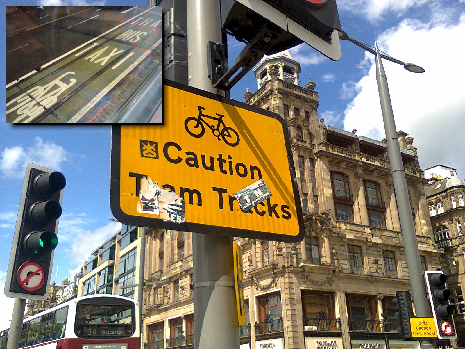 This is Edinburgh City Council's answer to one of the problems created by the poorly engineered tram line; tiny, non-standard signs, one of which I found mounted directly behind a traffic light box. The tram line includes a combined tram, bus, taxi, and cycle lane, proclaiming loudly the incompetent design. Cyclists are required to take a shallow angle across the tram tracks to follow the cycle route, and as a result there have been many injuries. The Dutch keep trams and cycles as far apart as possible, or have them cross at 90 degrees to each other, but where having cyclists cross tram rails at a shallow angle is unavoidable, there is a standard solution called VeloSTRAIL (www.strail.de/index.php?id=197&L=1). Edinburgh has opted for a cheap retrofit that will not solve the problem.