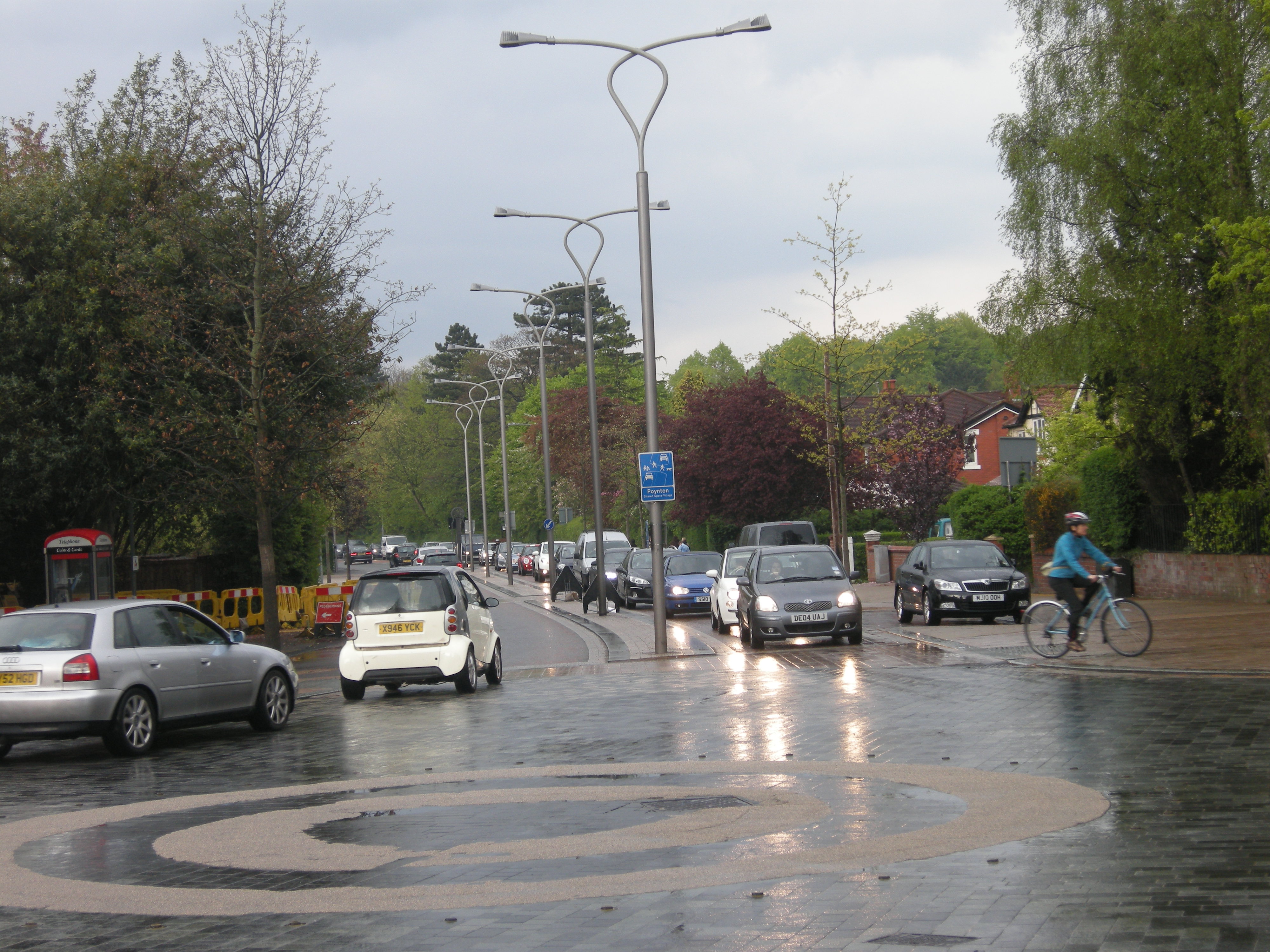 Poynton Shared Space. Long queues of traffic (even outside of the rush hour). Cars and cyclists on the pavement. Crumbling infrastructure. Be careful what you wish for. Photo from "Perspectives on Poynton", a blog post by aseasyasridingabike (https://aseasyasridingabike.wordpress.com/2014/06/16/poynton/).