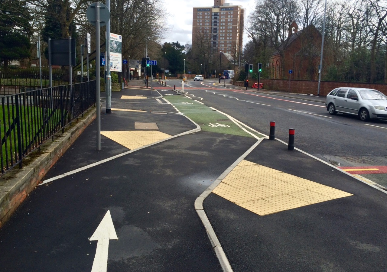 This photo shows the end of the bus stop bypass (the pedestrian crossing at the bottom of the photo) and how the cycle lane is taken across this side road. The cycle lane has clear priority over the side-road, and has been painted a clear green colour. That having been said, the physical protection has not extended right to the edge of the side road mouth, and my fear is that motor traffic may take this corner too quickly. Physical protection closer to the road mouth would have forced vehicles to take a tighter turning circle, and so travel more slowly. Just up the road from here is another side road with a wider mouth that may also have problems with motor vehicles taking the corner too quickly.