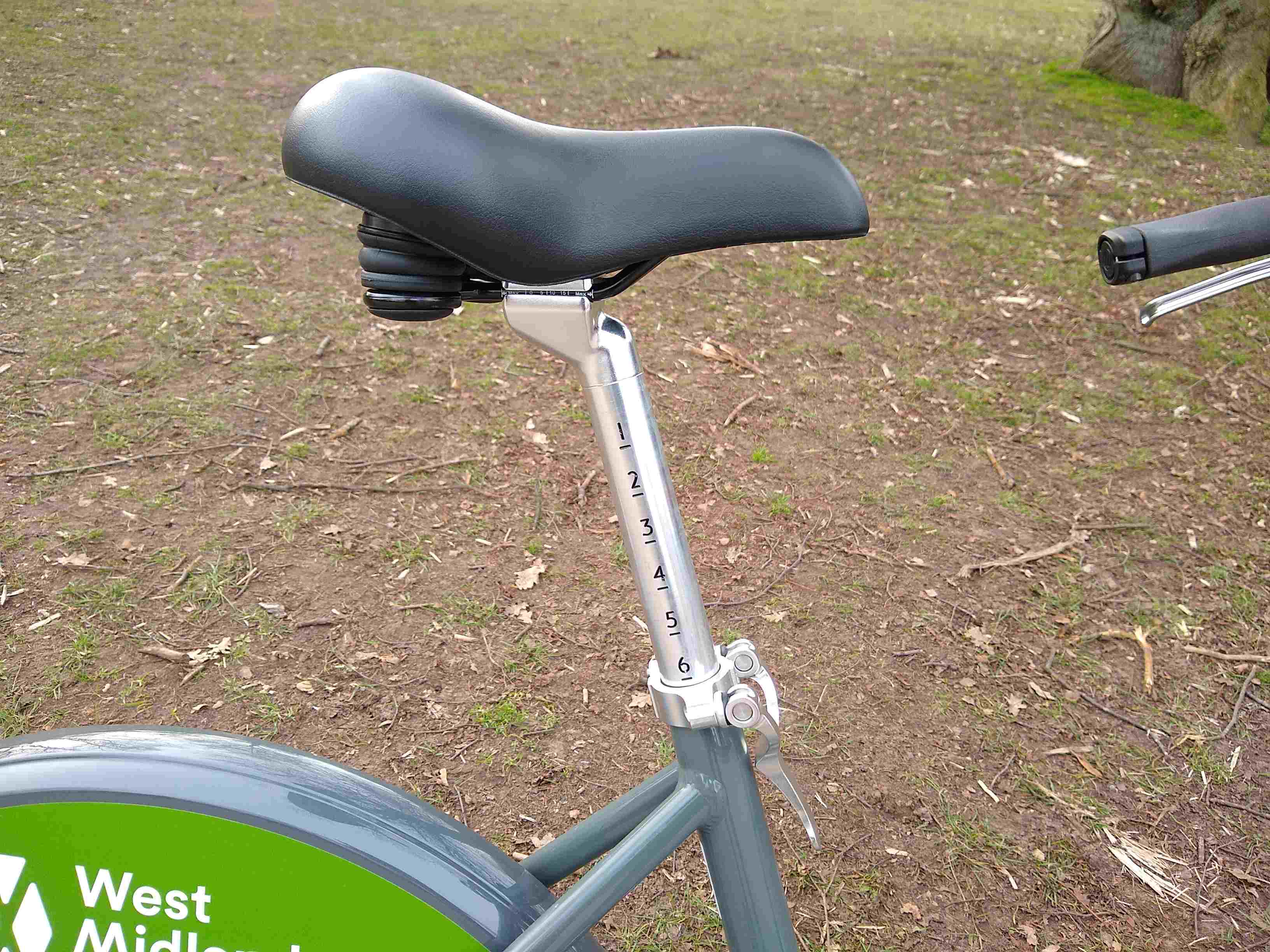 A closeup of the saddle and seatpost of a West Midlands hire bike. The seatpost is engraved with clear markings so you can set it to the right position each time, and the clamp has a generous lever for strong clamping force.